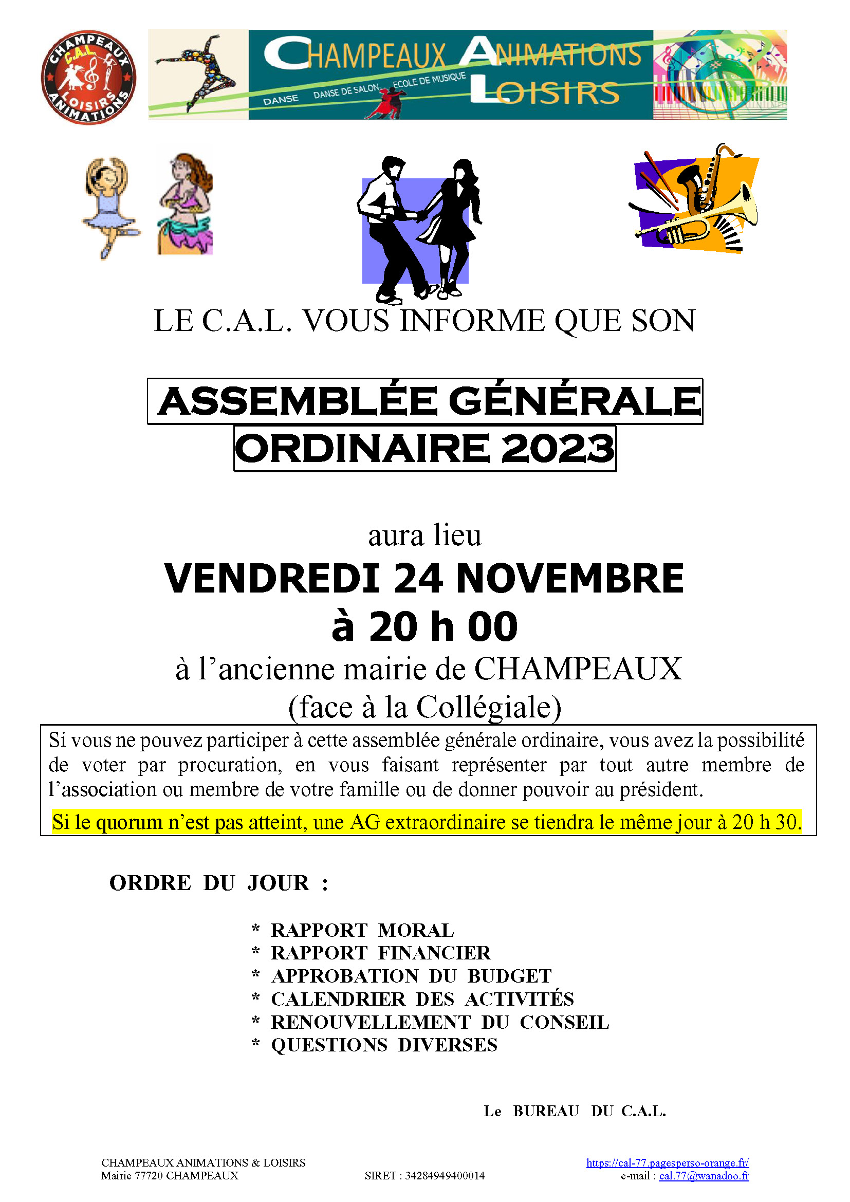 ![]() | L’ASSEMBLÉE GÉNÉRALE ORDINAIRE 2025 aura lieu en NOVEMBRE 2025 à 20 h 00 à l’ancienne mairie de CHAMPEAUX (face à la Collégiale) lien vers « Convocation et Pouvoir« |