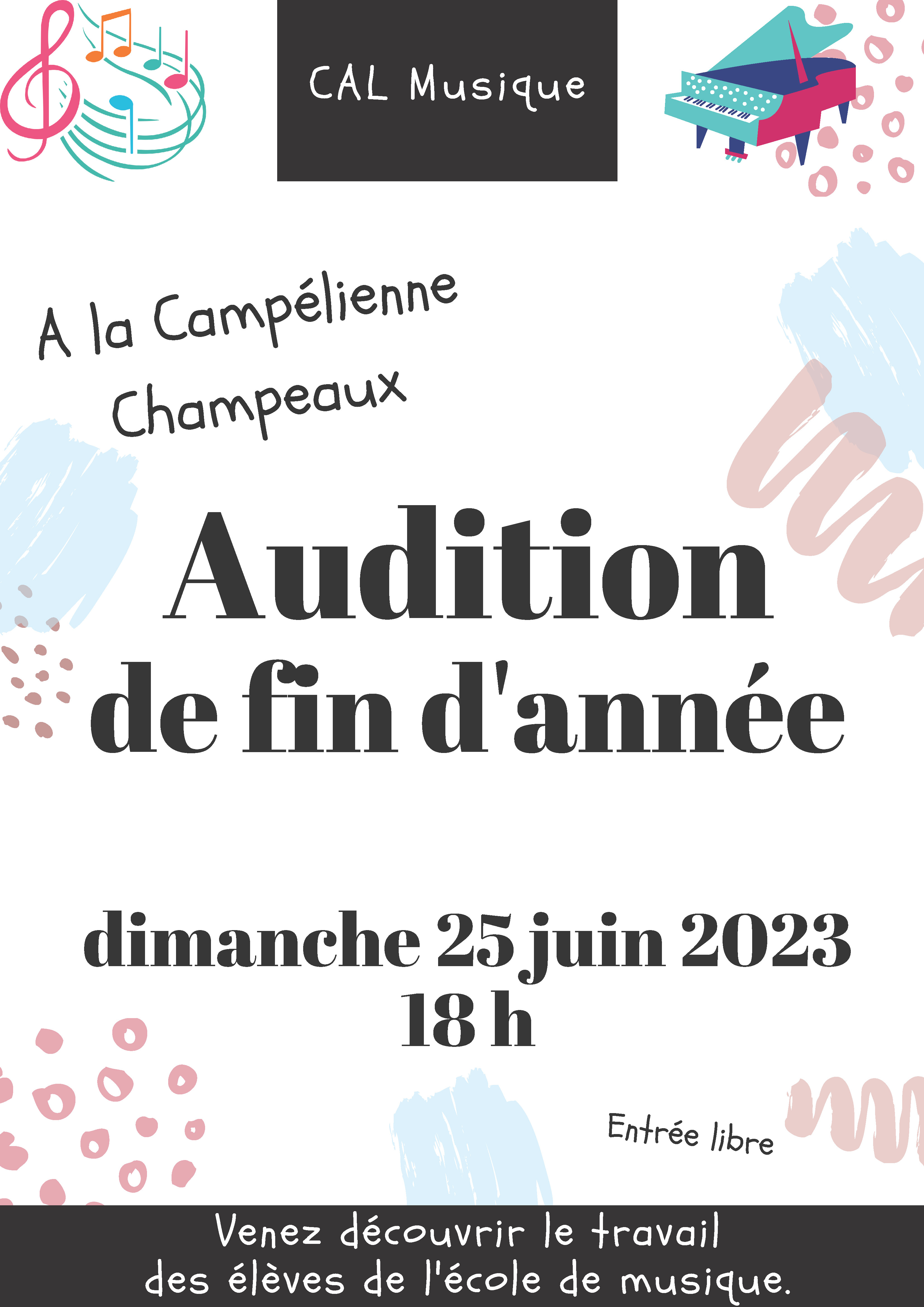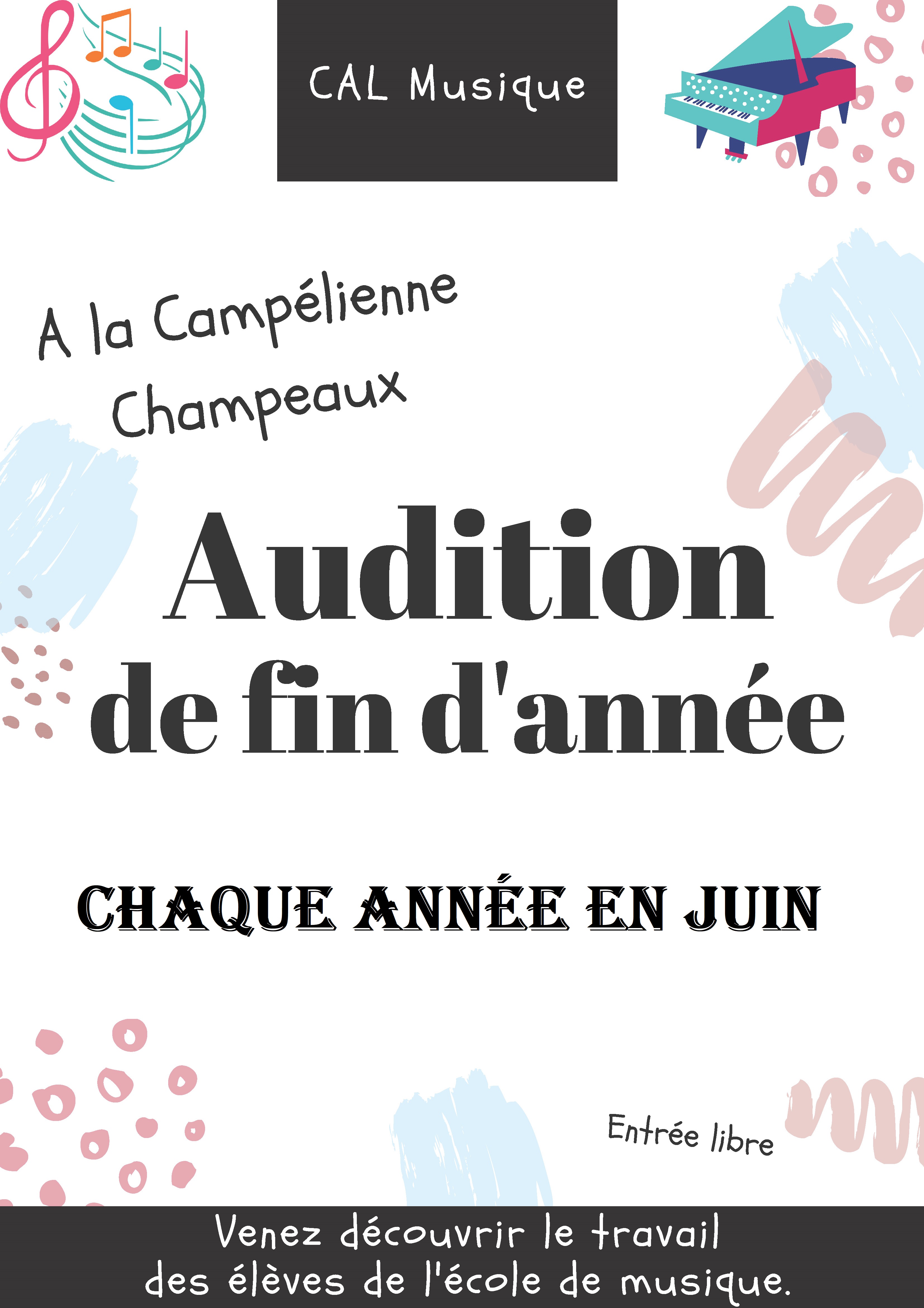 ![]() | L’audition de musique sera proposée à la salle des fêtes ‘La Campélienne,’ rue Sarrazin Desmaraise, en juin 2025. Venez découvrir le travail des élèves de l’école de musique ! |