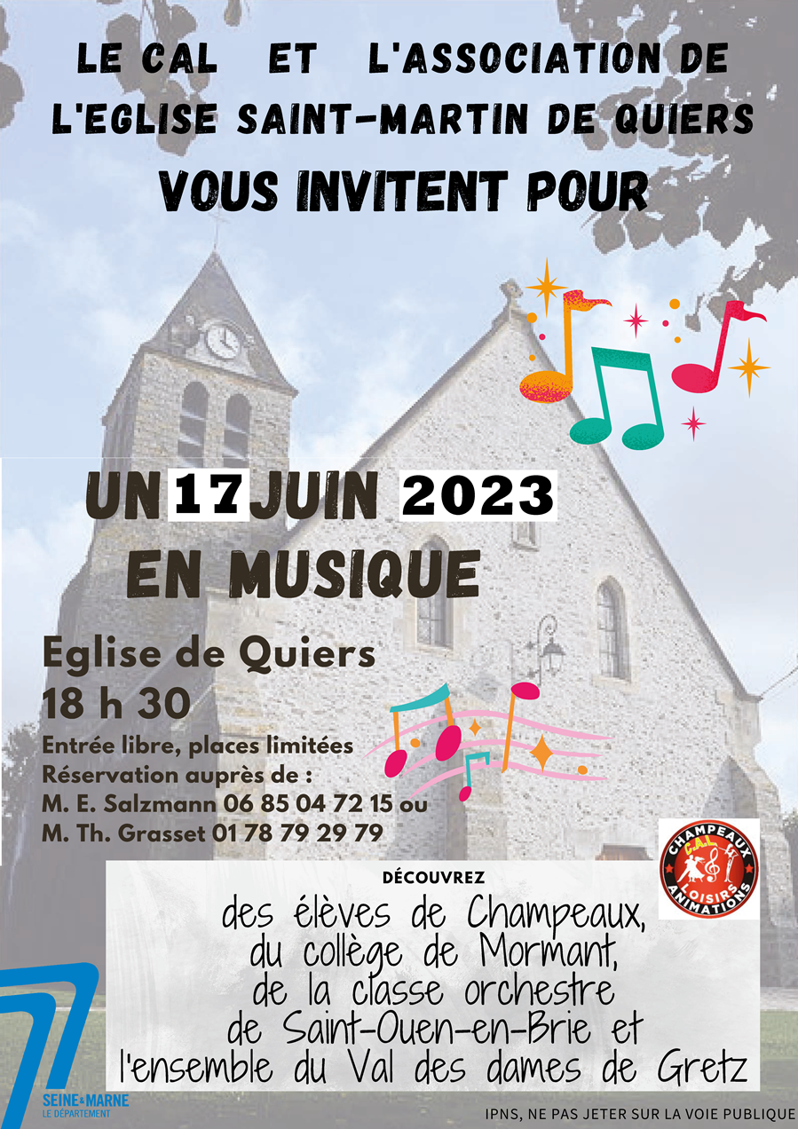 ![]() | Rencontre Inter-écoles de musique en juin 2026 qui vous permettra d’entendre les élèves de Champeaux, du collège de Mormant, de la classe orchestre de St-Ouen-en-Brie et l’ensemble du Val des dames de Gretz. Le CAL de Champeaux vous invite à ce concert à l’église de Quiers. Venez nombreux, c’est un concert exceptionnel qui a demandé aux musiciens, présents à cette occasion, du travail, des répétitions depuis le début de l’année. Vous ne pouvez pas les rater ! Faites-en part à vos contacts, amis, connaissances ! (Entrée libre) |