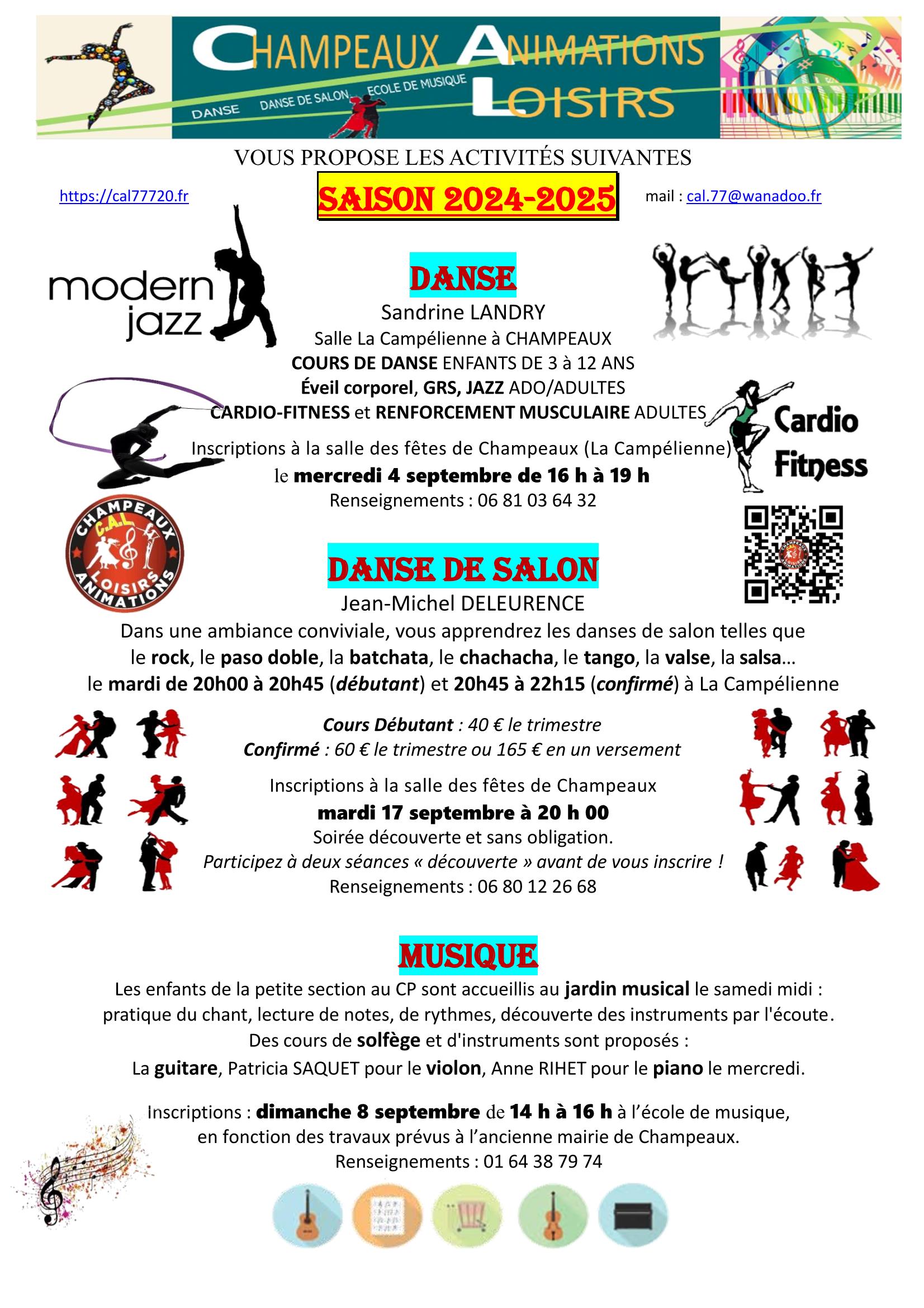 ![]() | Inscriptions 2025-2026 (Tarifs/Horaires) Danse : mercredi 3 septembre de 16 h à 19 h (fiche inscription) à la salle des fêtes de Champeaux (Renseignements : 06 81 03 64 32) Musique : dimanche 7 septembre de 14 h à 16 h (fiche inscription) à l’école de musique de Champeaux (Renseignements : 01 64 38 79 74) Danse de salon : mardi 17 septembre de 20 h 30 (fiche inscription) à la salle des fêtes de Champeaux (Renseignements : 06 80 12 26 68) A partir de la saison 2025-2026, le paiement en ligne sera possible (suivre le lien pour plus de détails) |